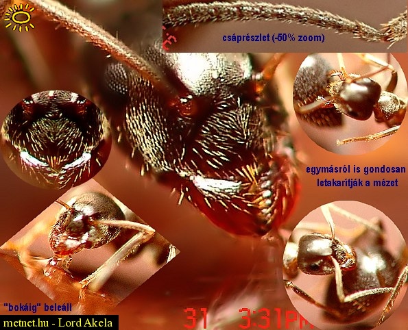 | Leírás: A kisebb testméretû hangyák élénken kutatnak (a nagyobb vöröseket még nem látom) Pár csepp mézzel helybenmaradásra bírtam õket, de "evés" közben is élénken mozognak, bemozdulnak. Sajnos a vaku itt-ott fehér foltokat produkált. "Tanulom" fotózásukat, lesz jobb is :) EXIF F5,6 ISO64 1/250sec (Sony F828) Videofelvétel is van a "nagy zabálásról" :) | |