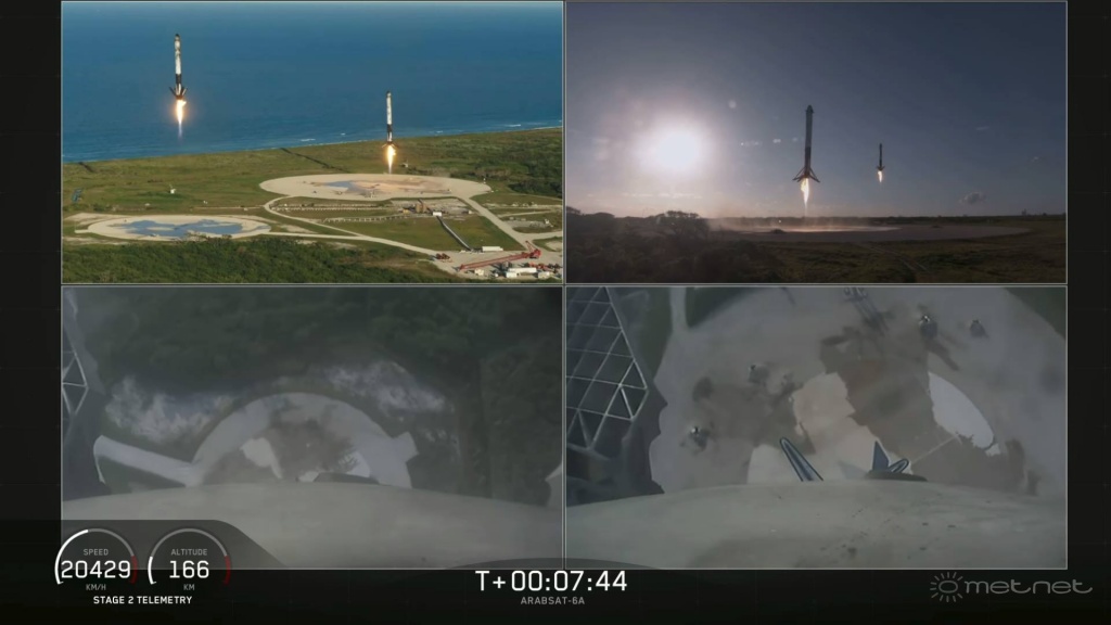 | Leírás: Egyszer már űrtörténelmi pillanat volt, most másodjára is sikerült a két oldalsó gyorsítófokozat épségben való visszarepülése és leszállása. - Falcon Heavy - Arabsat A6 | |