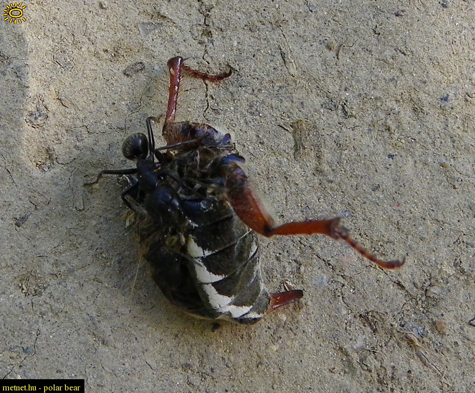 | Leírás: Fekete lóhangya egy elpusztult májusi cserebogár maradványait igyekszik elvonszolni (sikerrel). | |