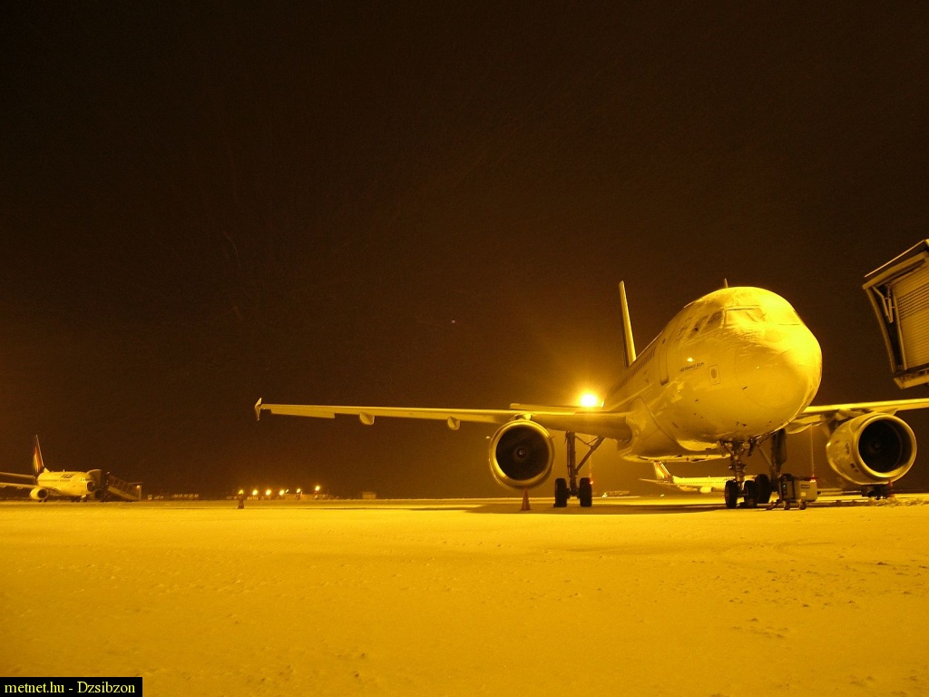 Leírás: Behavazott repülõtér és repülõgépek.