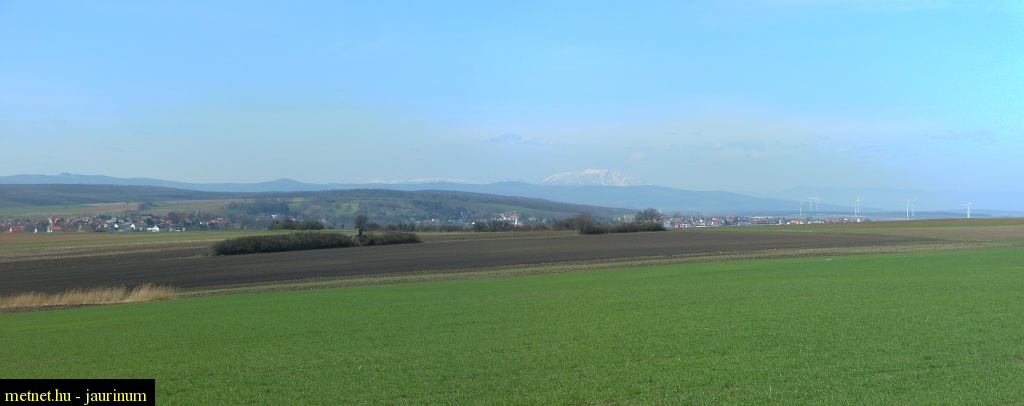 A kép közepén Sopronkertes, Darufalva, jobbra szélerõmûvek a Vulka völgyében, háttérben a Schneeberg magasodik.