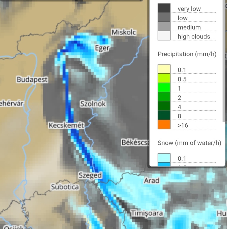 Hétfőn este melegfront érkezik, ami főként északra és keletre hoz csapadékot, zömében havat, de előfordul majd vegyes halmazállapotú csapadék is.