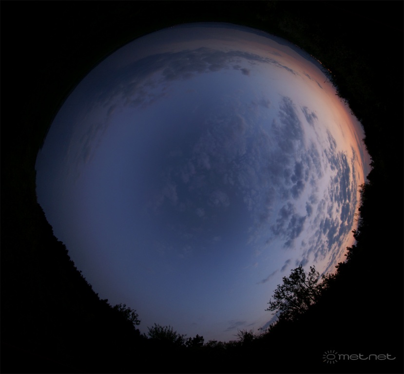 | Leírás: Teljes égbolt, napnyugta után kb 20 perccel. Jól látható, hogy a legsötétebb kék a Naptól 90 fokra lévõ területen van, köszönhetõen a Rayleigh-szórásnak. | |