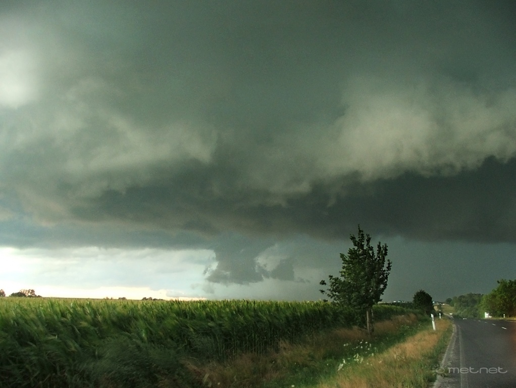 Leírás: A squall-line D-i szupercellájának falfelhõje a peremfelhõ alatt Sormásról