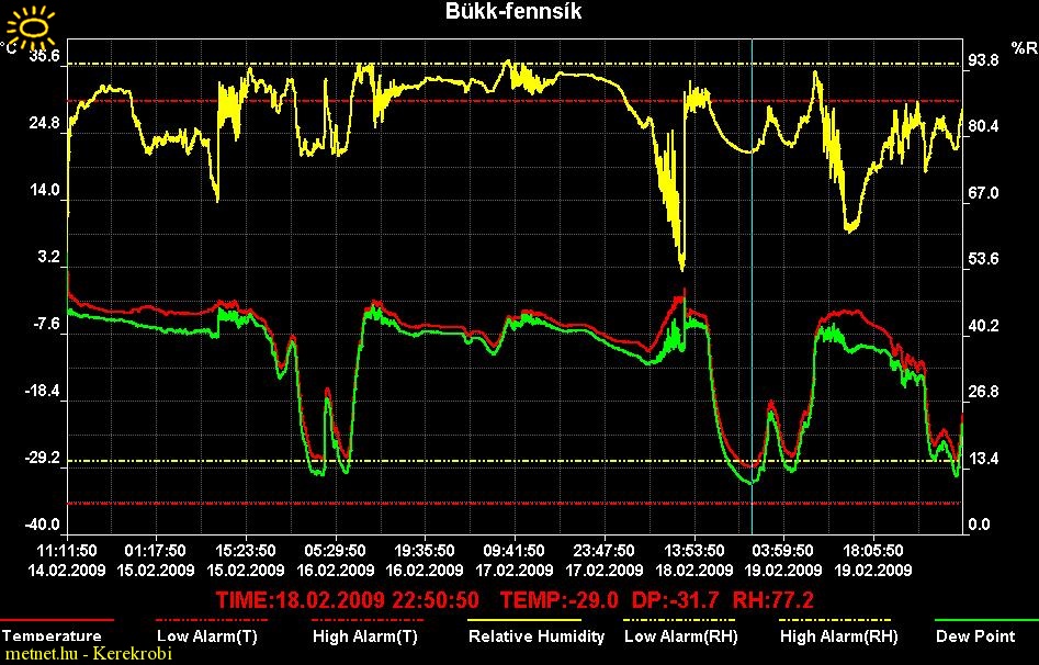 Leírás: Bükk-fennsík; fagyzug mérés. 2 m magasságban, egy töbör alján, árnyékolóval ellátva, mért hõmérsékleti értékek. 2009.02.14-20 között. Adat tároló tipusa: Volcraft; DL-120 TH; 1 perces mintavételi beállítással. Színek: piros: hõmérséklet; zöld: harmatpont; sárga: relatív páratartalom.