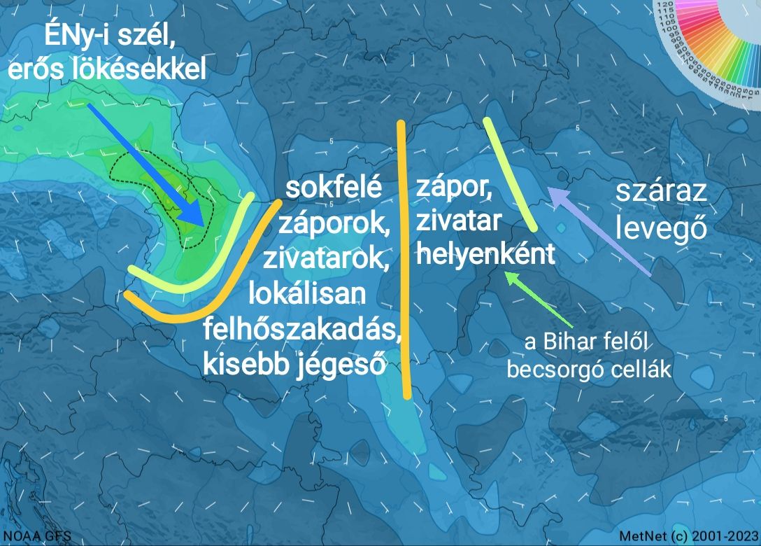 Az idő előrehaladtával a front kelet felé haladva nyomul be az országba, előterében a nappali órákban labilizálódik a légkör. Egyre több helyen záporok, zivatarok pattannak ki, legnagyobb valószínűséggel a Dunántúl déli részén és az ország középső sávjában.