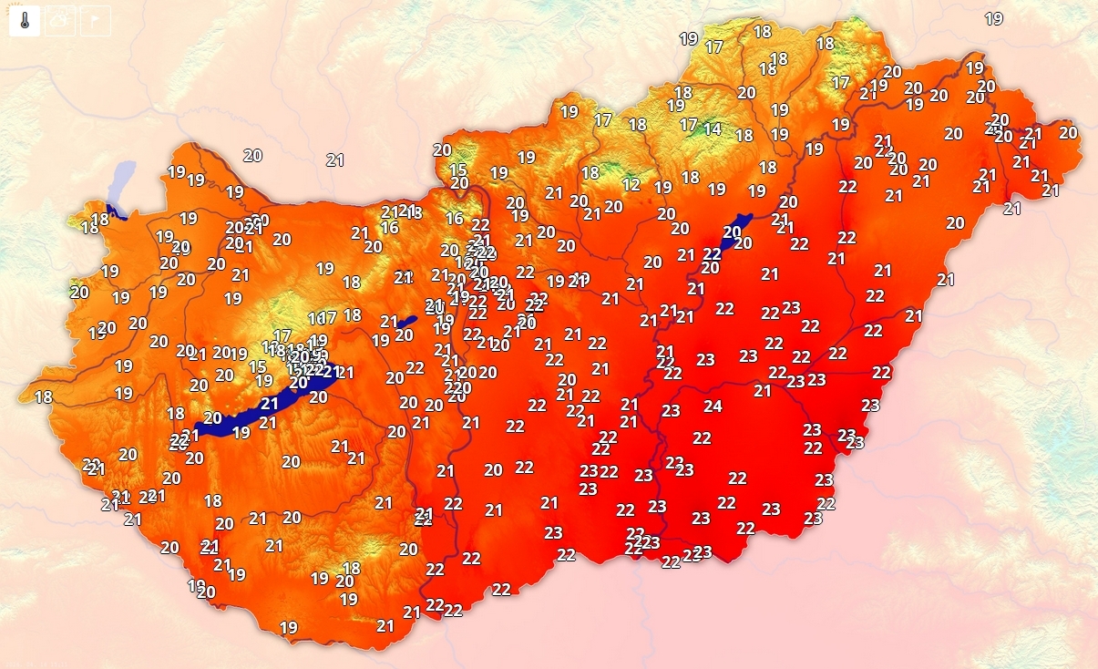 Az ország jelentős részén 20 fok körül a hőmérséklet, de a Dél-Alföldön már előfordulnak 25 fok közeli értékek is.